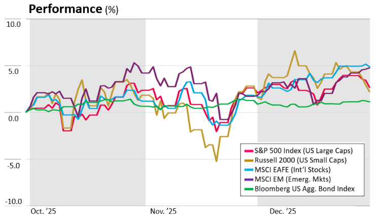 Despite the government shutdown and the quarter’s initial volatility, the fourth quarter ended on a high note. Economic growth and financial market performance in 2025 have been resilient despite a substantial drag from trade, consumer worries, and weakening labor markets. Consumer spending and business investment kept the economy accelerating forward. Even better, the economic headwinds are abating while fiscal and monetary stimulus is becoming stimulative. Betting on individual sectors or asset classes may be a fool’s errand at this point. Maintaining a well-diversified portfolio remains the best way to achieve financial goals.